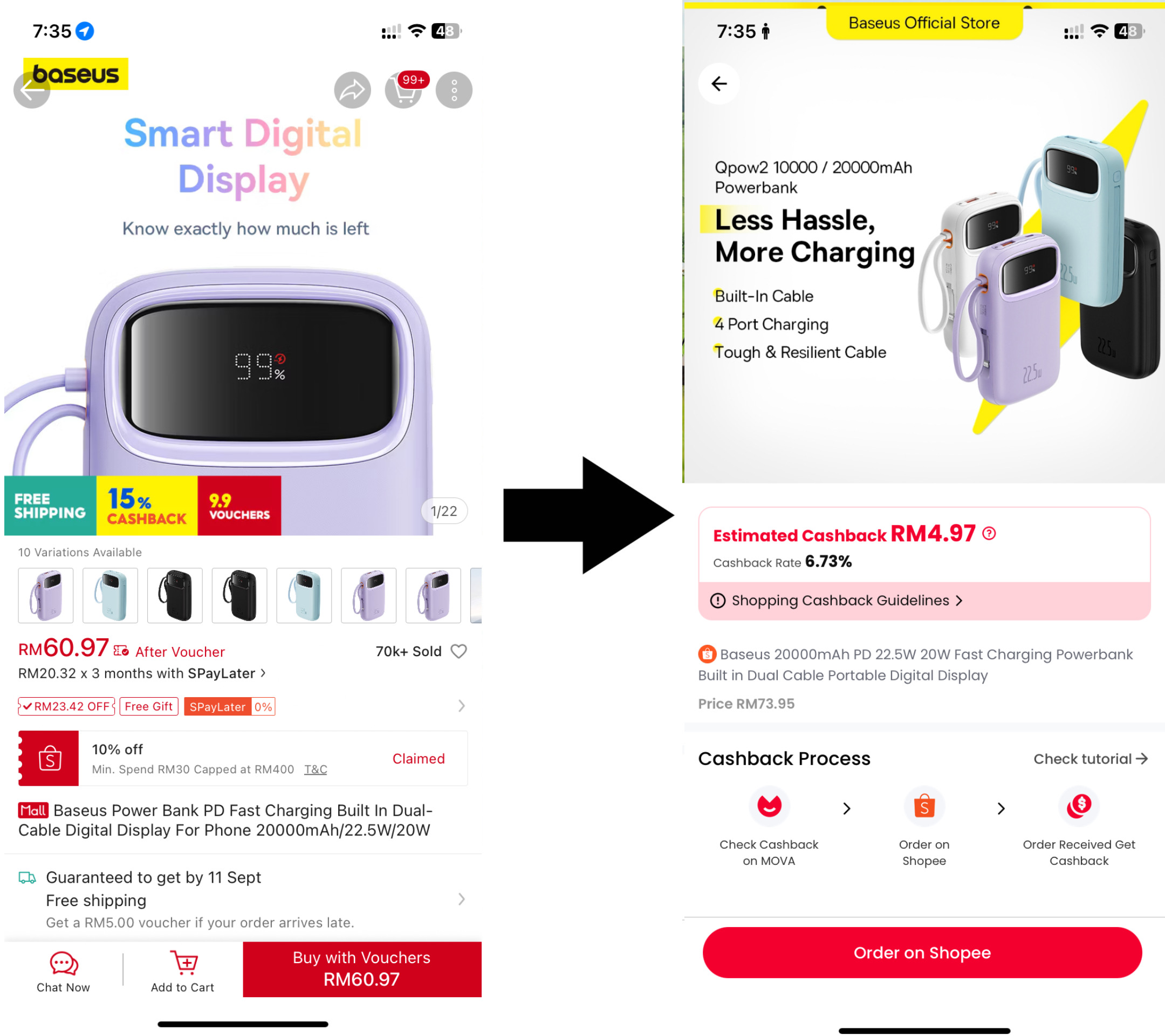 Bahagian paling menyeronokkan dalam MOVA ialah membeli-belah seperti biasa tetapi setiap kali, duit anda "beranak". Proses membeli amat mudah: buka aplikasi, pilih kedai atau produk yang anda mahu, buat pesanan, dan bayar seperti biasa. Bezanya, selepas pembayaran selesai, anda akan nampak jumlah cashback dikira secara automatik.