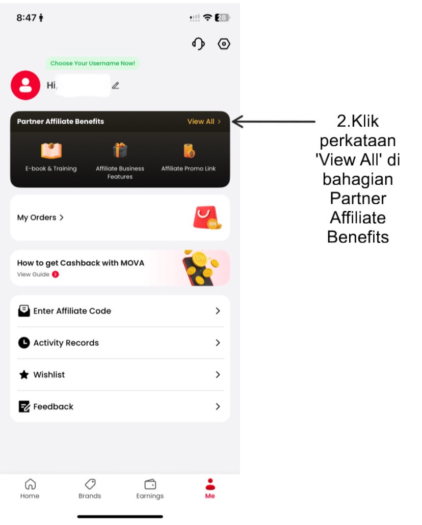 Selepas daftar, anda akan nampak profil akaun sendiri di bahagian "Me". Dari situ, anda boleh mula membuat pembelian, mengesan cashback, atau berkongsi link pendaftaran dengan orang lain. Semuanya direka untuk mudah difahami walaupun oleh pengguna kali pertama.